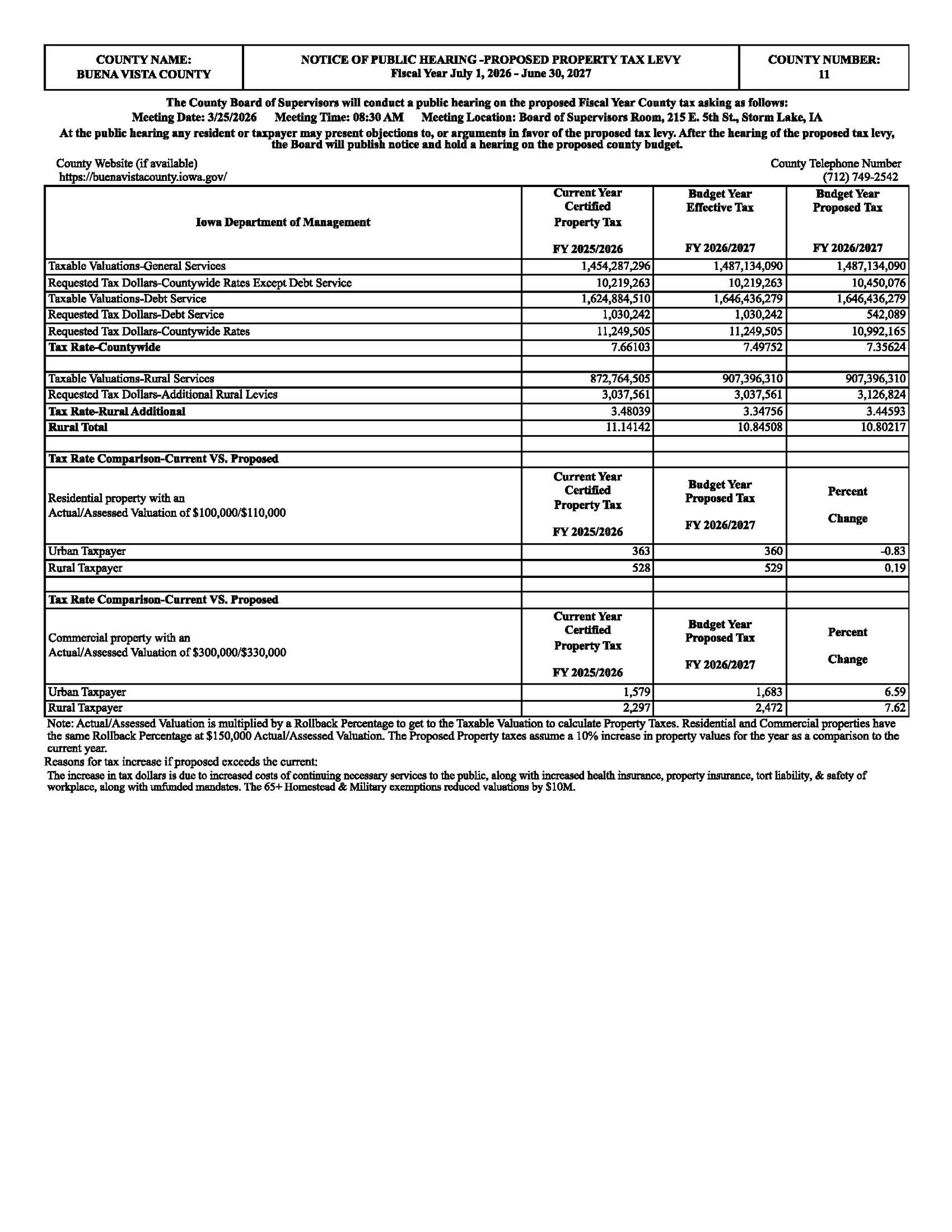 There will be a public hearing for the Proposed Tax Levy March 25, 2025 at 8:30 am in the Board of Supervisor Room, 215 E 5th St, Storm Lake, Iowa 50588.